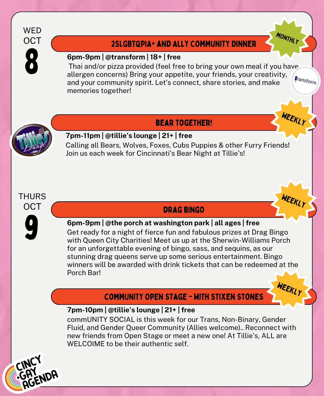 Get there at 6pm to get a seat and enjoy happy hour, singo starts at 7pm! All winners get prizes! See y’all there 🎶💃